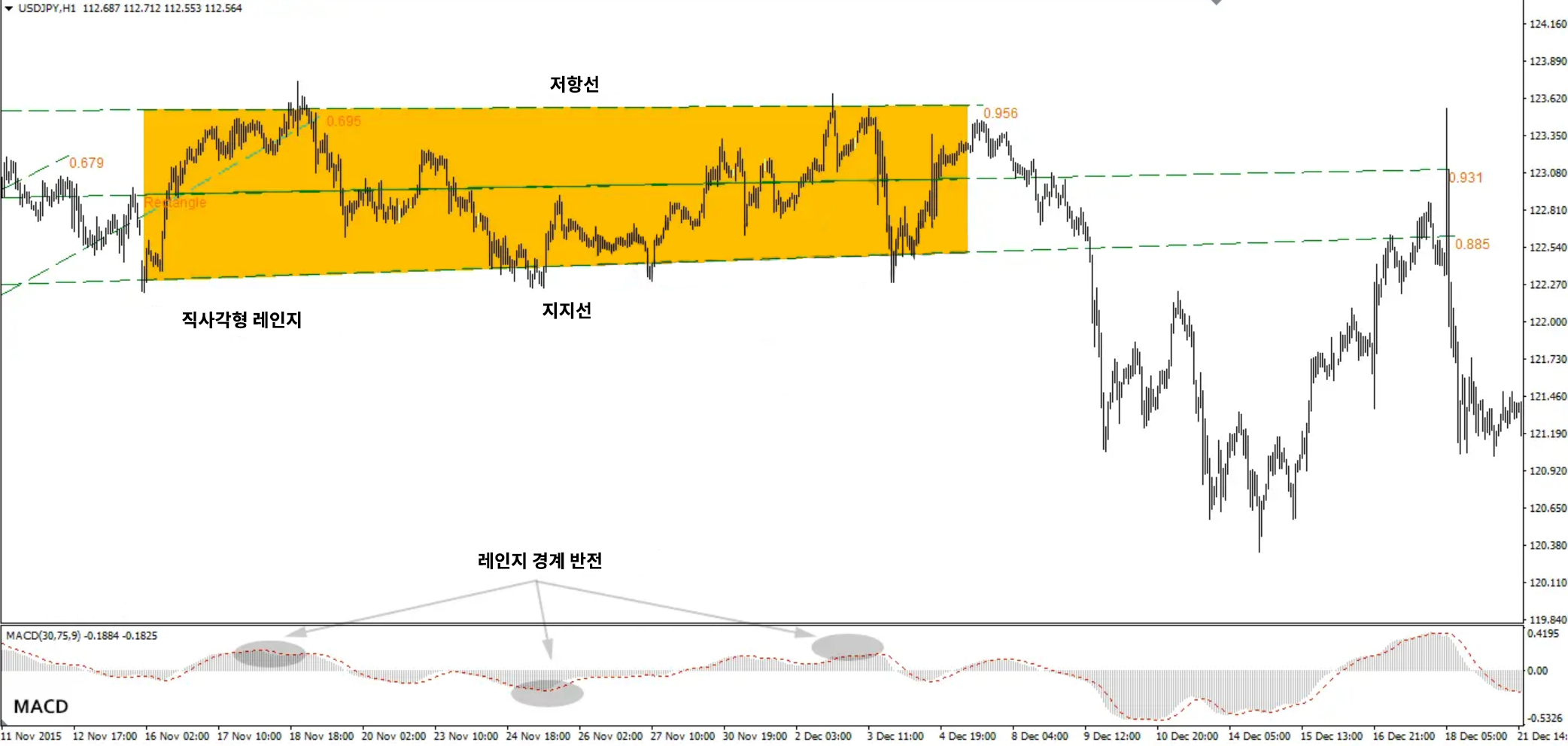 일부 레인지는 처음 보면 형태가 뚜렷하게 보이지 않을 때가 있습니다. 이러한 경우 가격은 중심 축을 기준으로 위아래로 움직이며, 그 주변에서 지지선과 저항선이 형성됩니다. 이때 추세선 분석 도구나 이동평균선과 같은 보조지표를 활용하면 레인지의 범위를 파악하고 주요 지지·저항 구간을 식별하는 데 도움이 됩니다.