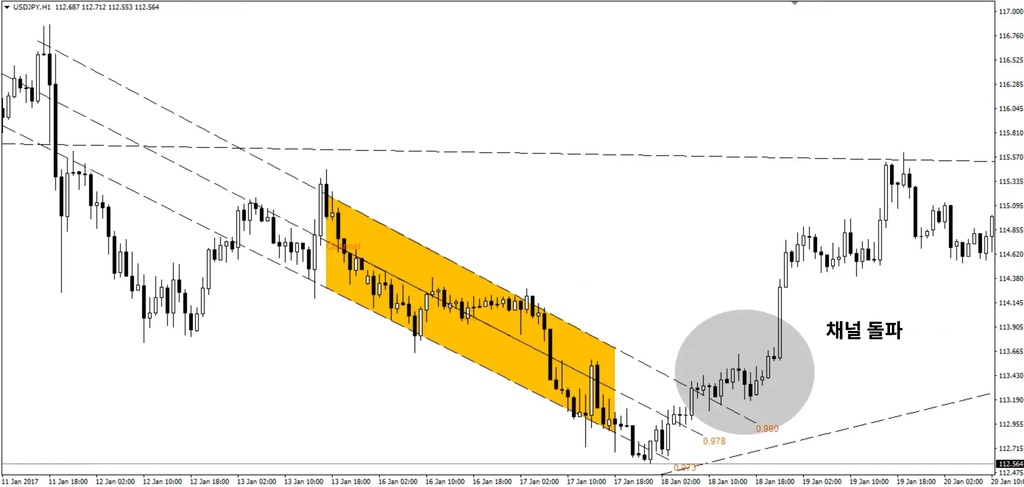 그림 4는 긴 하락 채널의 사례를 나타냅니다. 이 경우에는 가격이 강하게 위로 돌파하며, 큰 추세와는 반대로 되돌림이 발생하는 모습을 확인할 수 있습니다.