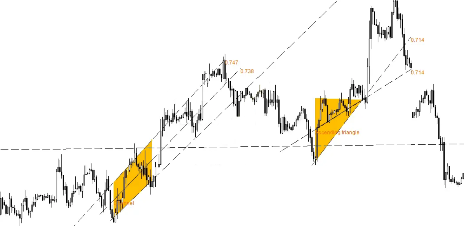 Price channels are a common pattern in forex charts. They work like ranges, but instead of moving sideways, the price moves up or down inside a slanted channel. Some channels are straight and rectangular, while others gradually narrow or widen over time.